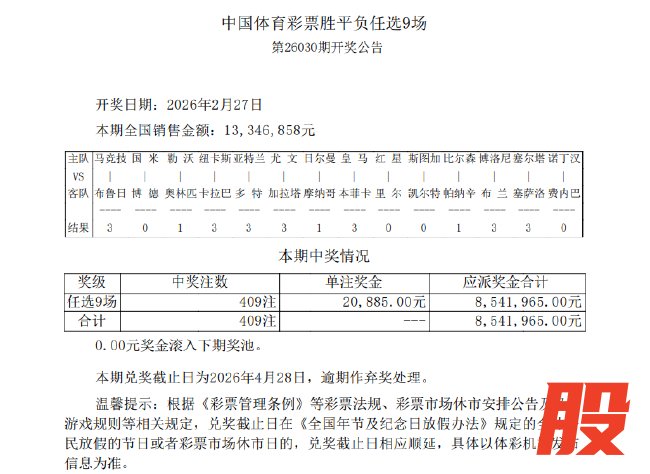 北京时间2月27日,足彩任九第26030期开奖结果揭晓。本期任选九场开出409注,单注奖金20885元。本期任九投注总额为13,346,858元。