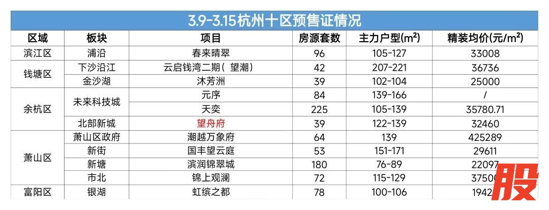 据网房产统计,本周(3.9-3.15)杭州十区共有11个项目取得预售证,新增房源972套,覆盖滨江、余杭、萧山、钱塘等多个区域,相比上周大涨约164%。