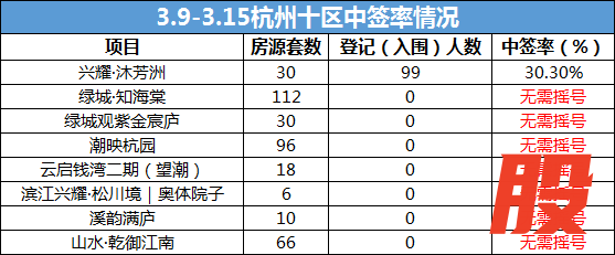 本周共有8个项目公示中签率结果,仅钱塘区大学城北的沐芳洲触发摇号——推出30套房源,吸引99组登记,中签率30.3%。其余7个项目均因登记人数不足而“无需摇号”。